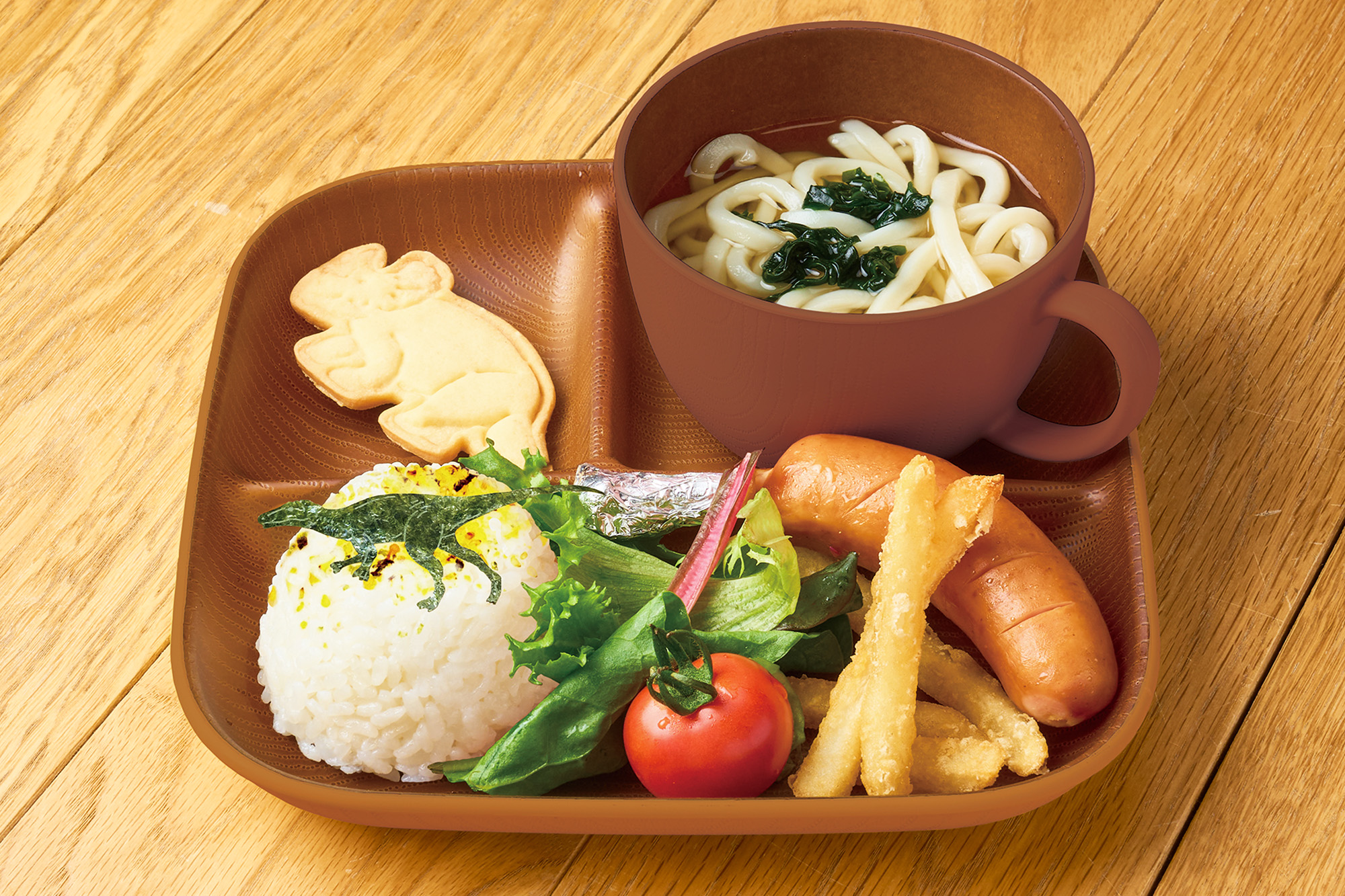 うどん+ご飯+骨付きウィンナー+ポテトのお子様セット